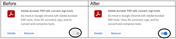 - Enable the Adobe Acrobat-Create PDF extension, by clicking the toggle switch to the right.